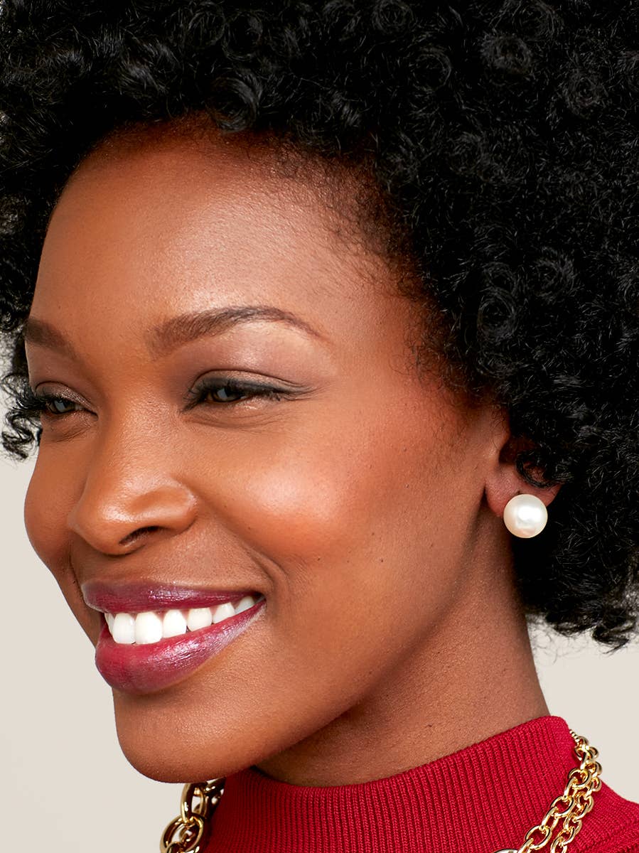 Chunky bead stud earring made of premium-grade faux pearl. Features shiny, gold-tone accents.