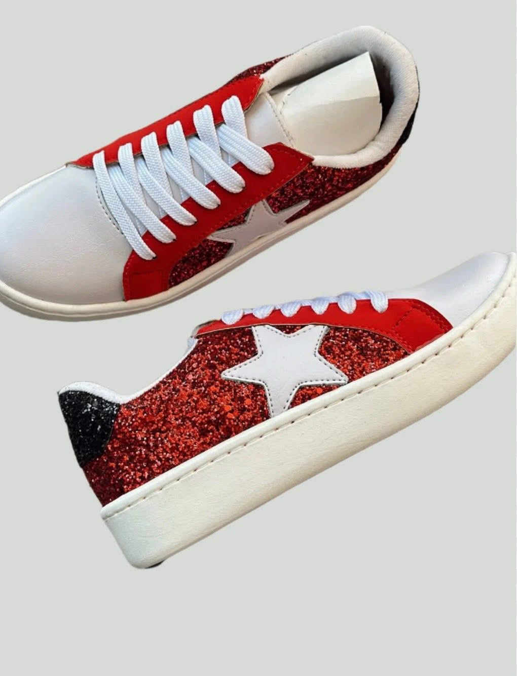 Step up your tailgate style with these sparkling stunners! Featuring bold red glitter sides, a crisp white star detail, and sleek white laces, these sneakers bring the perfect mix of sporty and glam. The comfy sole makes them game-day ready, while the glitter finish ensures you shine with every step. Finished with a touch of black sparkle on the heel for extra flair—these kicks are made to cheer on your team in style! 🏈✨