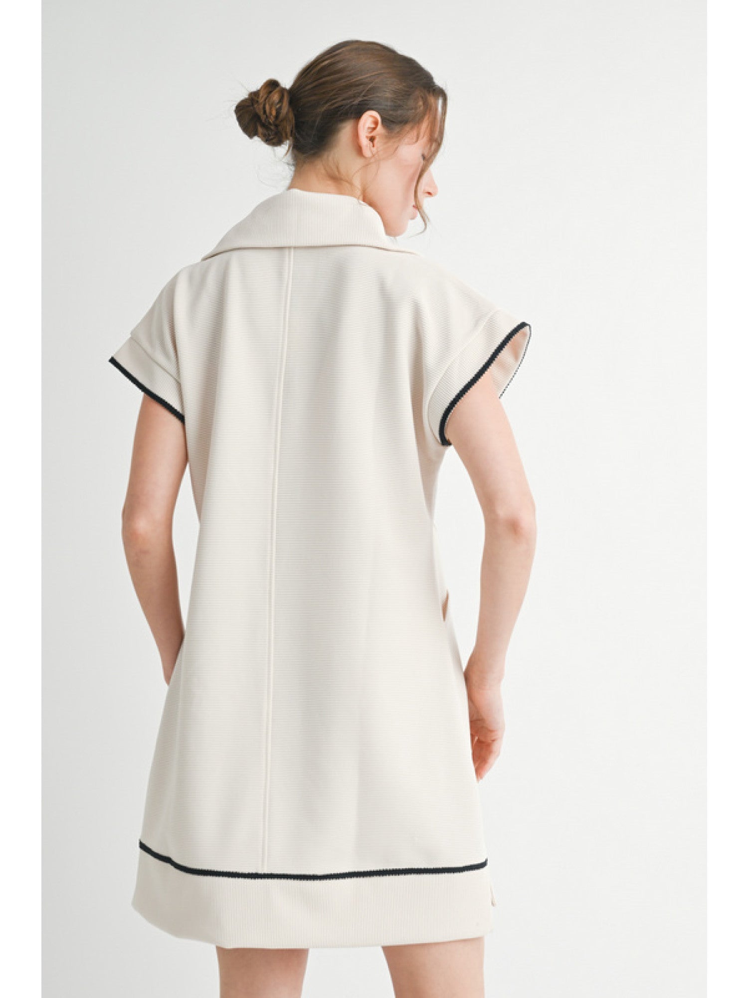 Textured dress with wide collared neck features zipper closure, front pockets, short sleeves, color trimming edge, and side slit detailing.