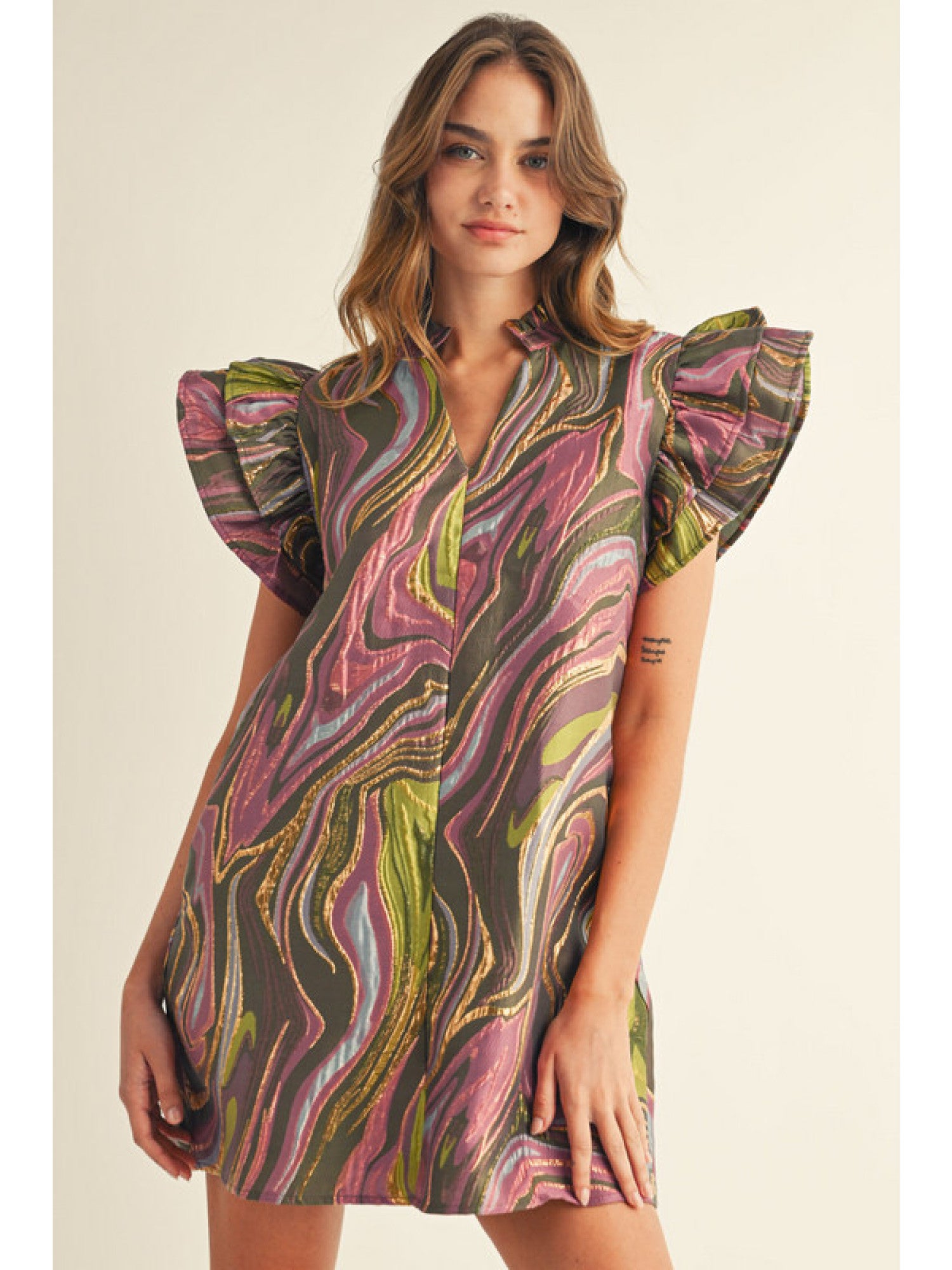 Make a bold and beautiful statement in our Swirls of Chic Ruffle Dress! This eye-catching piece features an abstract swirl print in rich shades of olive, plum, and gold β the perfect combo of fun and sophistication. The ruffled sleeves and subtle shimmer add a flirty, feminine touch, while the easy shift silhouette keeps it comfortable and flattering for every occasion.